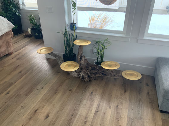 Golden Plates is a functional sculpture made from an intricate piece of drift wood I collected on the beach at Salsipuedes, Baja, MX. My mom and I carried it up a steep cliffside and drove it home to Utah. I cleaned it and sanded it for months, trying to see what it wanted to become. At some point I saw a clear vision of a coffee table concept with 5 gold plates. It took another year at least before I happened upon these $1 plates at a local thrift shop. It's a reminder of how clearly vision can proceed manifestation.